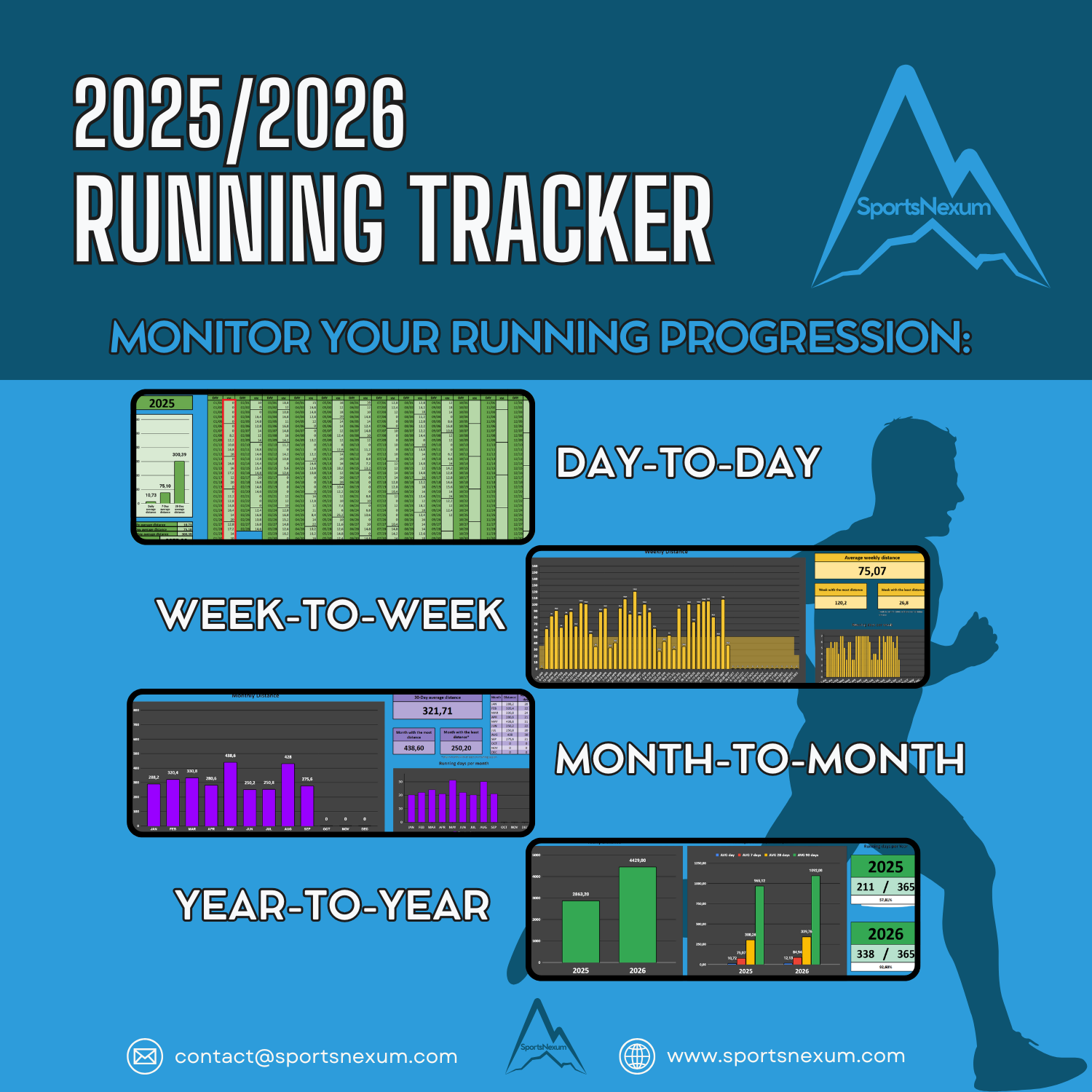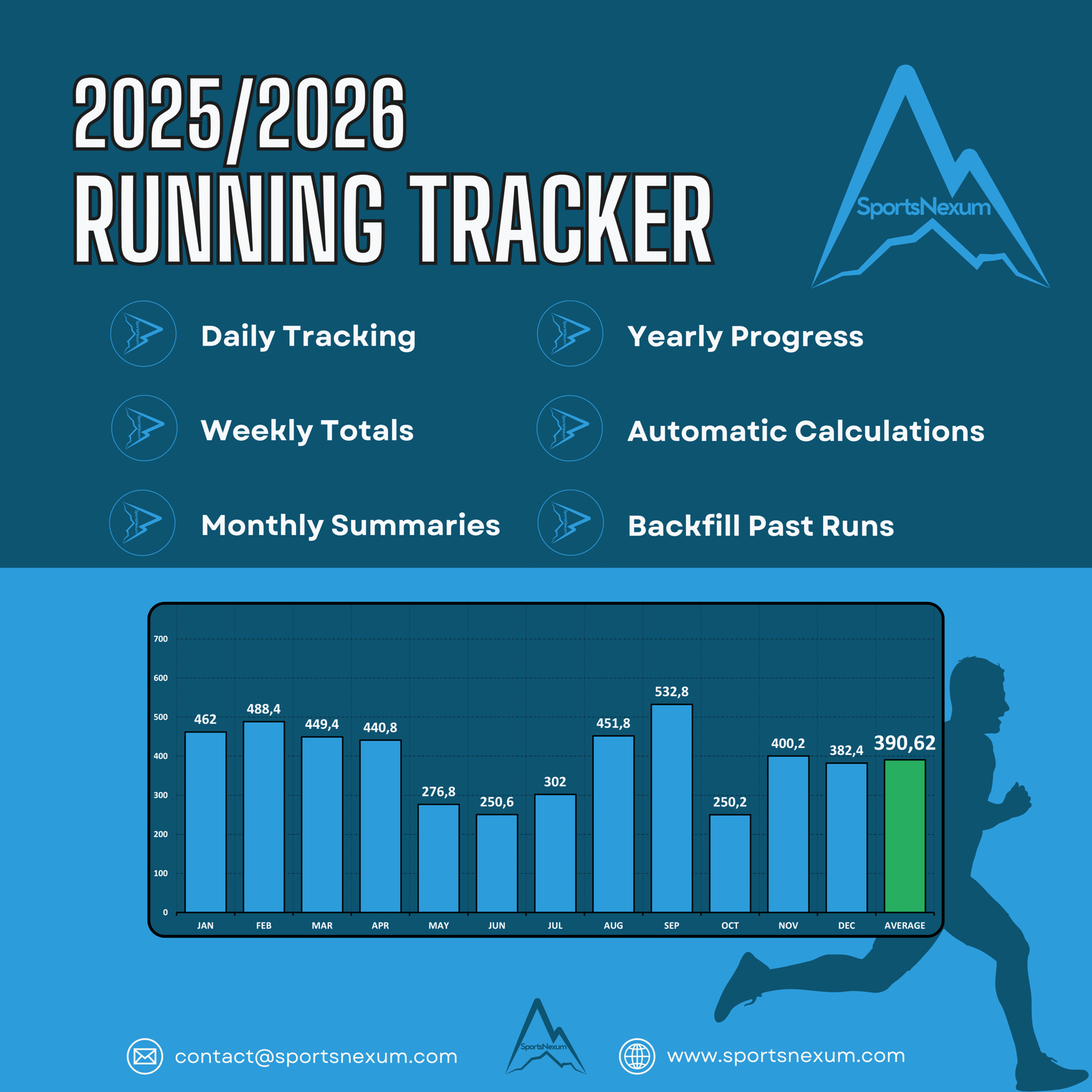 Every great performance starts with consistency. The SportsNexum 2025/2026 Running Distance Tracker gives you a clear, simple way to monitor your training and stay motivated all year long.